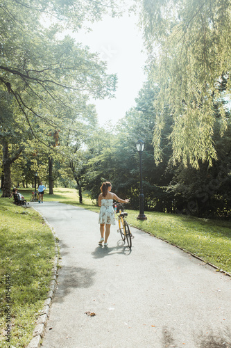 Back view of faceless female in light casual clothing walking with bicycle on asphalt path amid green plants on sunny day
