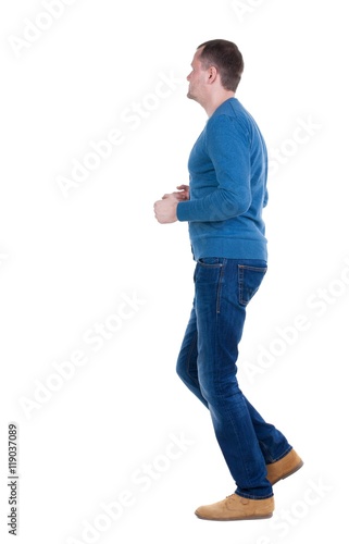 back view of running man in blue pullover. walking guy in motion. Rear view people collection. backside view of person. Isolated over white background.