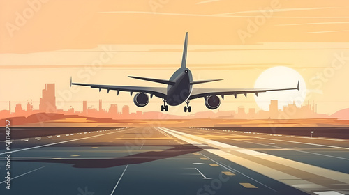 back view Passenger plane comes in for landing on the runway of the city airport. The illustration is multichrome orange, blue and grey. AI generated