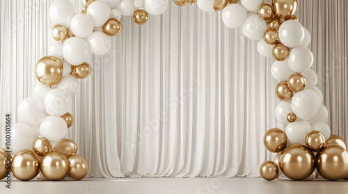 backdrop of a white and gold balloon arch with small round balloons, large foil balloons on the floor in front of an empty curtain backdrop wall.