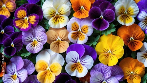 Background featuring colorful edible flowers: isolated viola blooms.