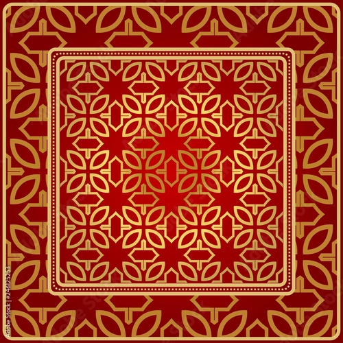Background, Geometric Pattern With Ornate Lace Frame. Illustration. For Scarf Print, Fabric, Covers, Scrapbooking, Bandana, Pareo, Shawl. Red golden color