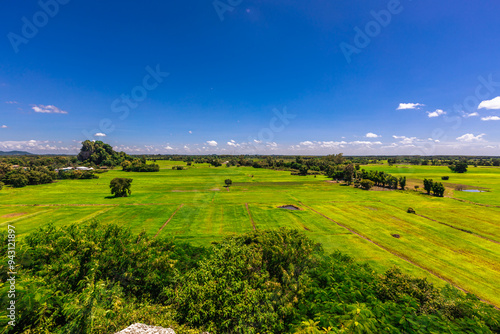 Background of a religious tourist attraction in Phitsanulok, Thailand, Wat Pa Rang Mi Wanaram, with a large Buddha statue on a mountain, overlooking the surrounding green rice fields.