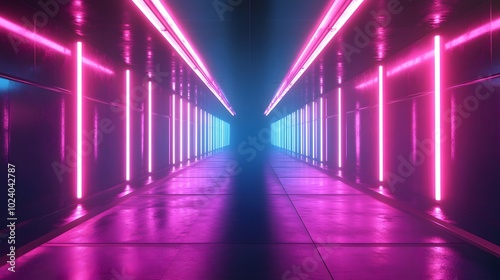 Background of empty show scene. Empty dark modern abstract neon background. Glow of neon lights on an empty stage, diodes, rays and lines. Lights of the night city.