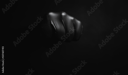 Background of hands in black gloves. Horror and hand monsters. Black hand gestures.