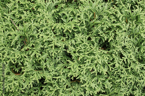 background of twigs and needles of green thuja.