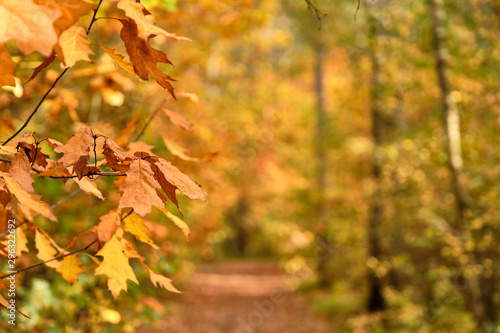 Background with beautiful autumn leaves in front of an autumnal footpath through a forest in October in Franconia, Germany