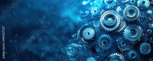 background with blue and silver gears symbolizing technology and innovation in a dynamic layout