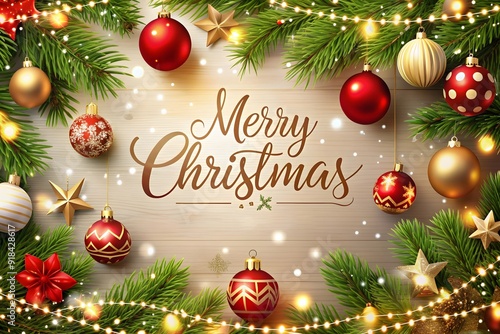 Background with lettering Merry Christmas, realistic pine branches, luminous garlands, serpentine, glitter gold snowflake. Christmas greeting card, poster, postcard, banner
