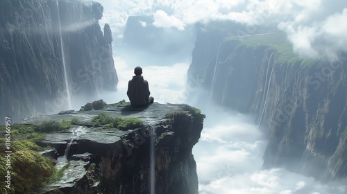Background with man on cliff overlooking otherworldly valley, AI-generative