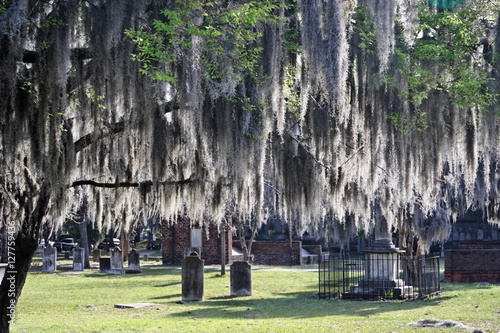 Backlit Spanish moss in Savannah cemetery. Horizontal.