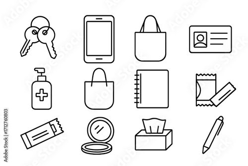 Bag Essentials Icons. Line style icons of personal essentials in bag: house keys, mobile phone, wallet icon, ID card, hand