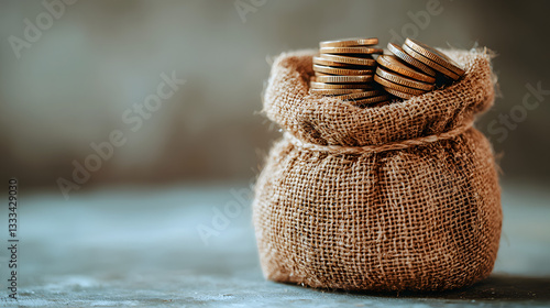 Bag of Gold Coins: A jute sack overflowing with gleaming gold coins rests on a textured surface, symbolizing wealth, savings, and financial prosperity.
