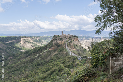 Bagnoregio, Italy - September 28 2024: Panoramic view on Civita di Bagnoregio. Picturesque Ancient Hilltop Etruscan era village with Historic Architecture and Stunning Panoramic Views. Italian summer.