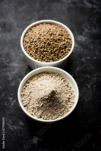 Bajra (pearl millet) / sorghum grains with it's flour or powder in a bowl, selective focus