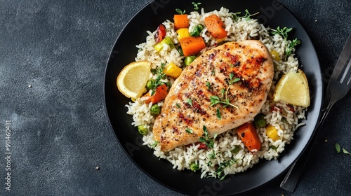 Baked chicken fillet with rice and vegetables on a black plate, top view, free copy space.