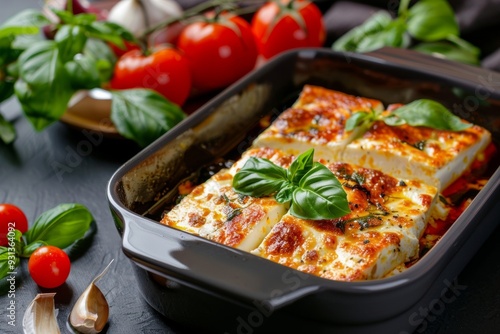 Baked feta cheese with fresh basil, embodying a rustic and delicious Mediterranean cuisine concept with a focus on simplicity and rich flavors.