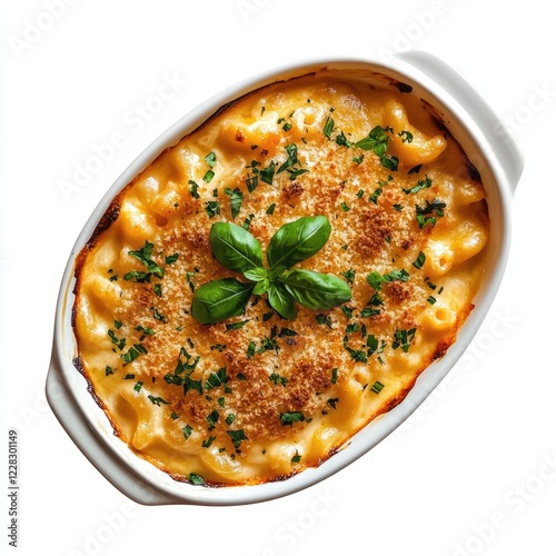 Baked Macaroni and Cheese with Herb Garnish in White Serving Dish on Wooden Surface