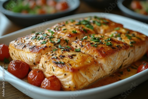 Baked Salmon with Asparagus and Cherry Tomatoes Garnished with Fresh Herbs