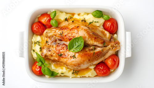 Baked turkey with mashed potatoes and tomatoes isolated on white, top view