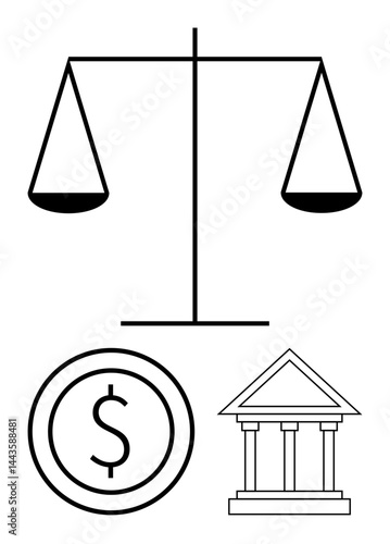 Balance scale symbolizing justice, dollar sign for economy, bank building for institutions. Ideal for justice, economy, finance, law, banking, equity social systems simple landing page