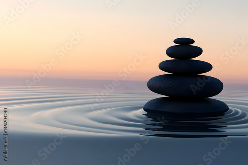 Balanced zen stones rise above still water as ripples expand at pastel dawn, symbolizing harmony, stability, and mindfulness.