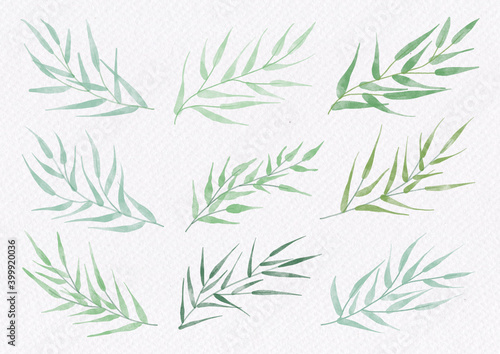 Bamboo leaves digital paint on watercolor paper texture. Art decoration illustration.