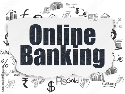 Banking concept: Painted black text Online Banking on Torn Paper background with Hand Drawn Finance Icons