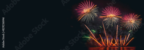 Banner Colorful vibrant Firework celebrate anniversary happy new year 2024, 4th of july holiday festival. Banner firework night celebrate national holiday. countdown new year 2025 with copy space