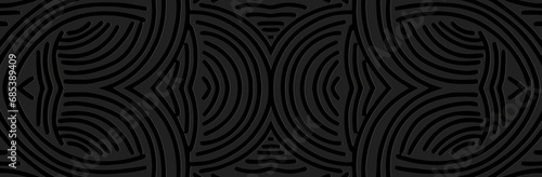 Banner, cover design. Embossed ethnic tribal geometric stylish 3D pattern on black background. Abstraction, handmade, anti-stress. Motifs of the peoples of the East, Asia, India, Mexico, Aztec, Peru.