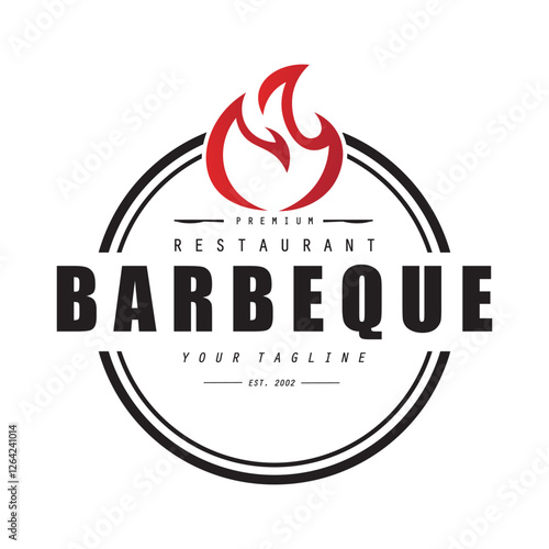 Barbeque logo design. Grill symbol with fire, spatula, and fork concept. Vintage BBQ badge vector