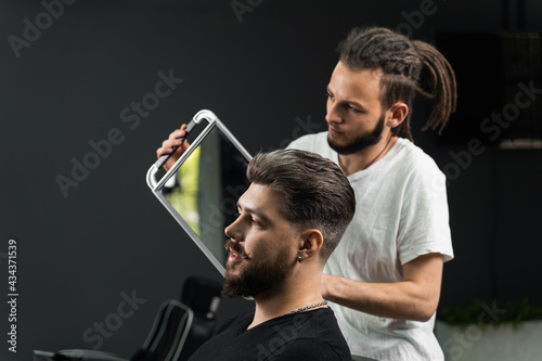 Barber with dreadlocks showing result of low fade machine hair and beard cut for bearded man in barbershop. Hairstyle with a smooth transition.
