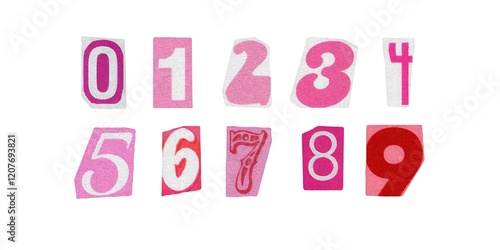 barbiecore set of cut-out numbers from magazines on a white background, cute retro y2k ransom style