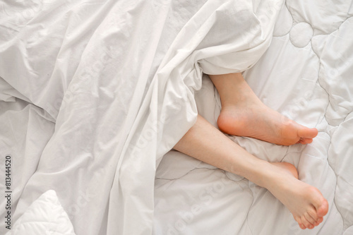 Bare feet in bed under white cotton blanket, good sleep, comfort sleeping bedding concept, minimalist Nordic bedroom