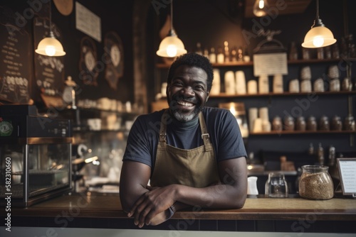 barista in coffee shop happy working behind the counter having fun smiling - generative ai