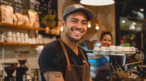 Barista smiling warmly at the camera in a cozy and inviting coffee shop ambiance