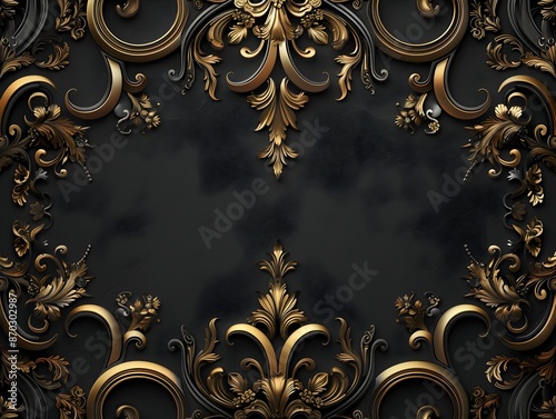 Baroque Opulent Gold Flourish Pattern on Glossy Black Background with Copy Space