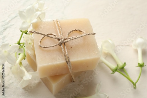 Bars of soap and jasmine flowers on light table, closeup