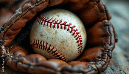 Baseball resting in a worn leather glove on a rustic surface after a game