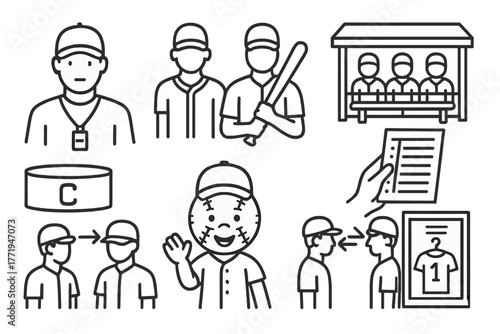 Baseball Team Icons. Line style icons of Baseball Team: Coach, Players, Dugout, Lineup Card, Armband, Mascot, Substitution, Locker