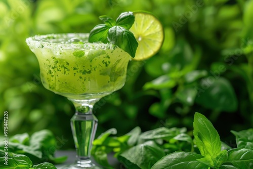 Basil Margarita with basil leaves and lime, served in a margarita glass, herb garden background, copy space