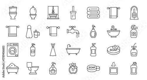 Bathroom Essentials Collection: A comprehensive collection of meticulously crafted, minimalist line art icons that elegantly represent the key elements of a modern bathroom.