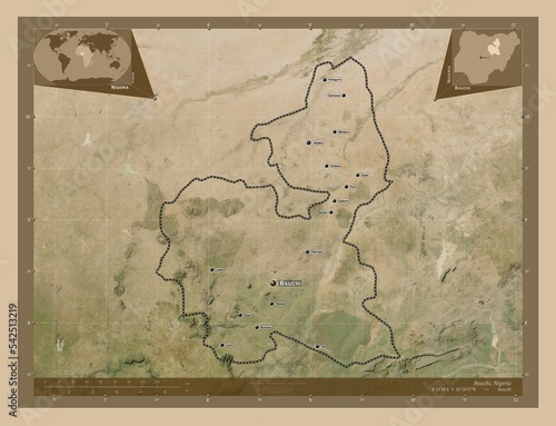 Bauchi, Nigeria. Low-res satellite. Labelled points of cities