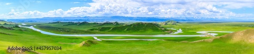 Bayinbuluke grassland natural scenery in Xinjiang,China.The winding river is on the green grassland.Panoramic view.