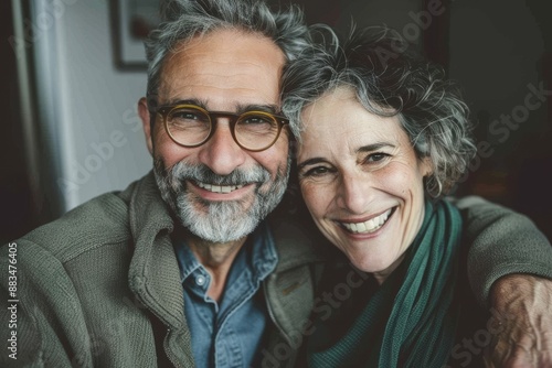 Be healthy. Sporty and happy middle-aged couple in headphones running together through the city street in the morning. Beautiful simple AI generated image in 4K, unique.