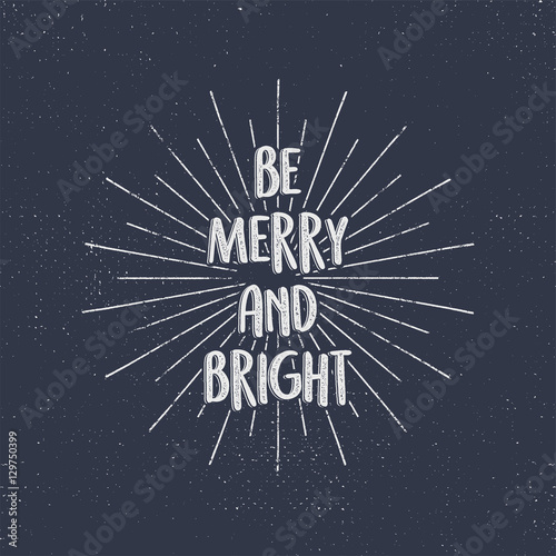 Be Merry and Bright holiday lettering, christmas wish, saying and vintage label. Season's greetings calligraphy. Seasonal typography design. Vector design. Letters composition with sun bursts