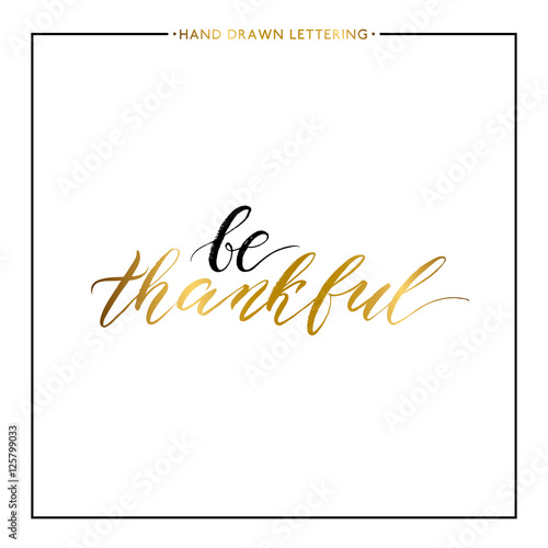 Be thankful gold text isolated on white background, hand painted letter, golden vector thanksgiving lettering for greeting card, poster, banner, print, handwritten calligraphy