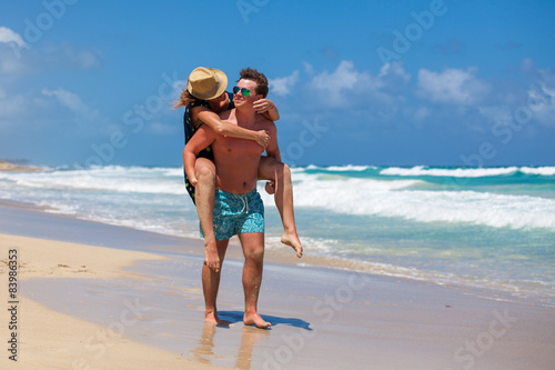 Beach couple walking on romantic travel.