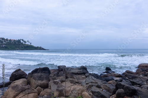 Beach landscape, Beautiful arial view of beach with sea waves and coconut trees. Nature scenery.