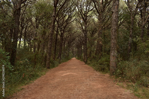 Beach, sea and pinewood on the seaside in Marina di Cecina, Tuscany, Italy. Panoramic view of the coast with pinewood, clear blue water and nice sand in a summer day